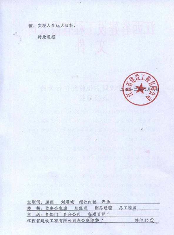 關(guān)于劉君誠同志拒收紅包的表揚(yáng)通報(bào)